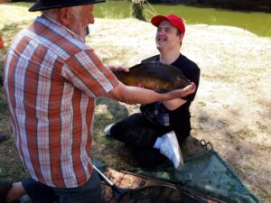 Après le départ des jeunes handicapés, Pierre nous a fait une nouvelle fois la démonstration de son savoir faire en capturant, avec sa canne à mouche, la belle carpe de 14kg, qu’il a mis un certain temps à sortir de l’eau. Félicitations.