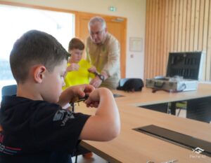 Avait été mis à notre disposition un stand couvert en plein air, avec tables et chaises .La Fédération avait prévu 2 créneaux d’initiation au montage de mouches en salle, et 2 créneaux d’initiation au lancer mouche sur pré.