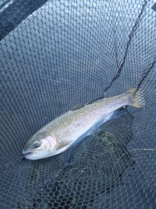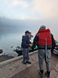 La météo du jour, grand soleil et absence de vent, était favorable à l’observation du paysage et à la promenade, un peu moins à la pêche, les poissons restant pour la plupart invisibles, au large et en profondeur. De belles truites arc-en-ciel ont néanmoins été prises et relâchées, en sèche, en nymphe et au streamer, du bord comme en bateau.
