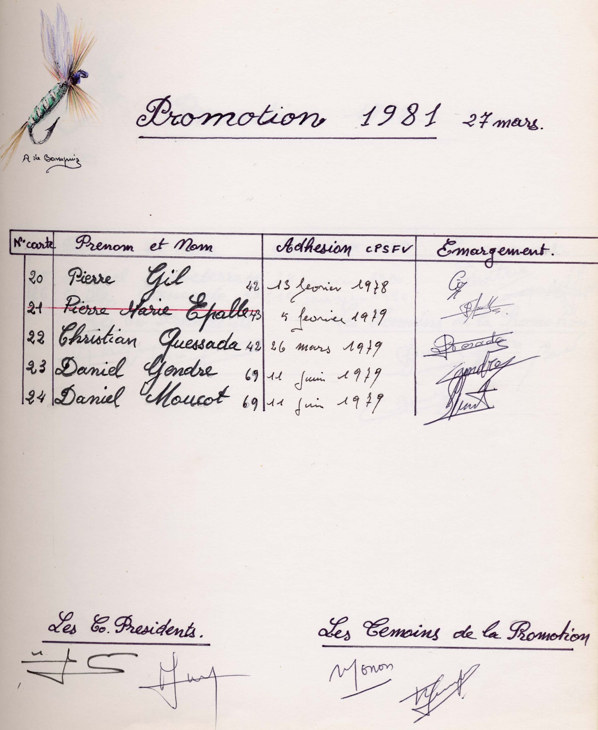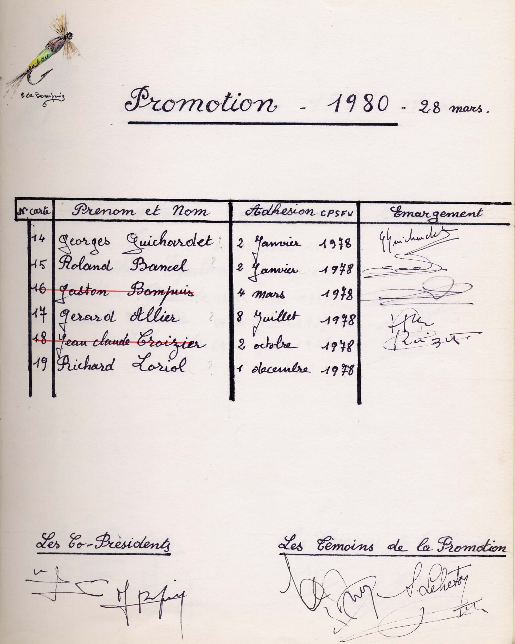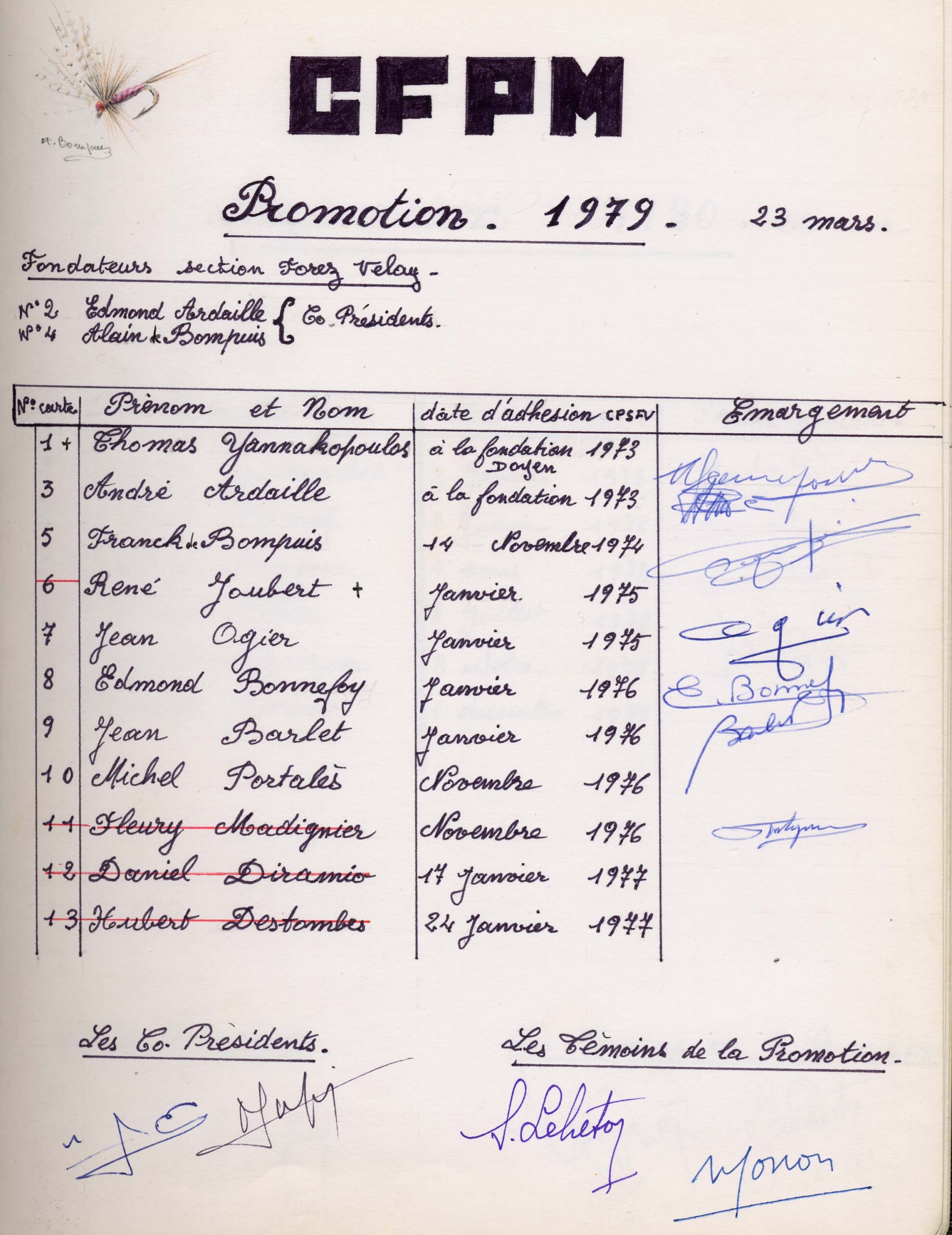 La première promotion du C.F.P.M. de la Loire a eu lieu le 23 Mars 1979 en présence des deux co-présidents fondateurs: Edmond ARDAILLE et Alain DE BOMPUIS.